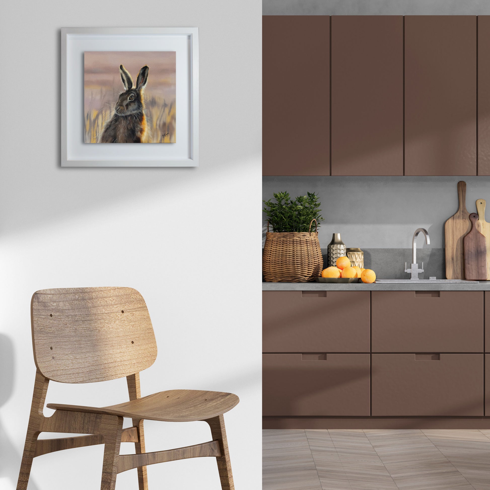 The piece is presented in a contemporary, minimalist frame designed to keep focus on the hare. Its clean lines enhance the artwork without distraction, allowing the hare to almost lift from the canvas with a striking three-dimensional presence, as though it might move at any moment.
