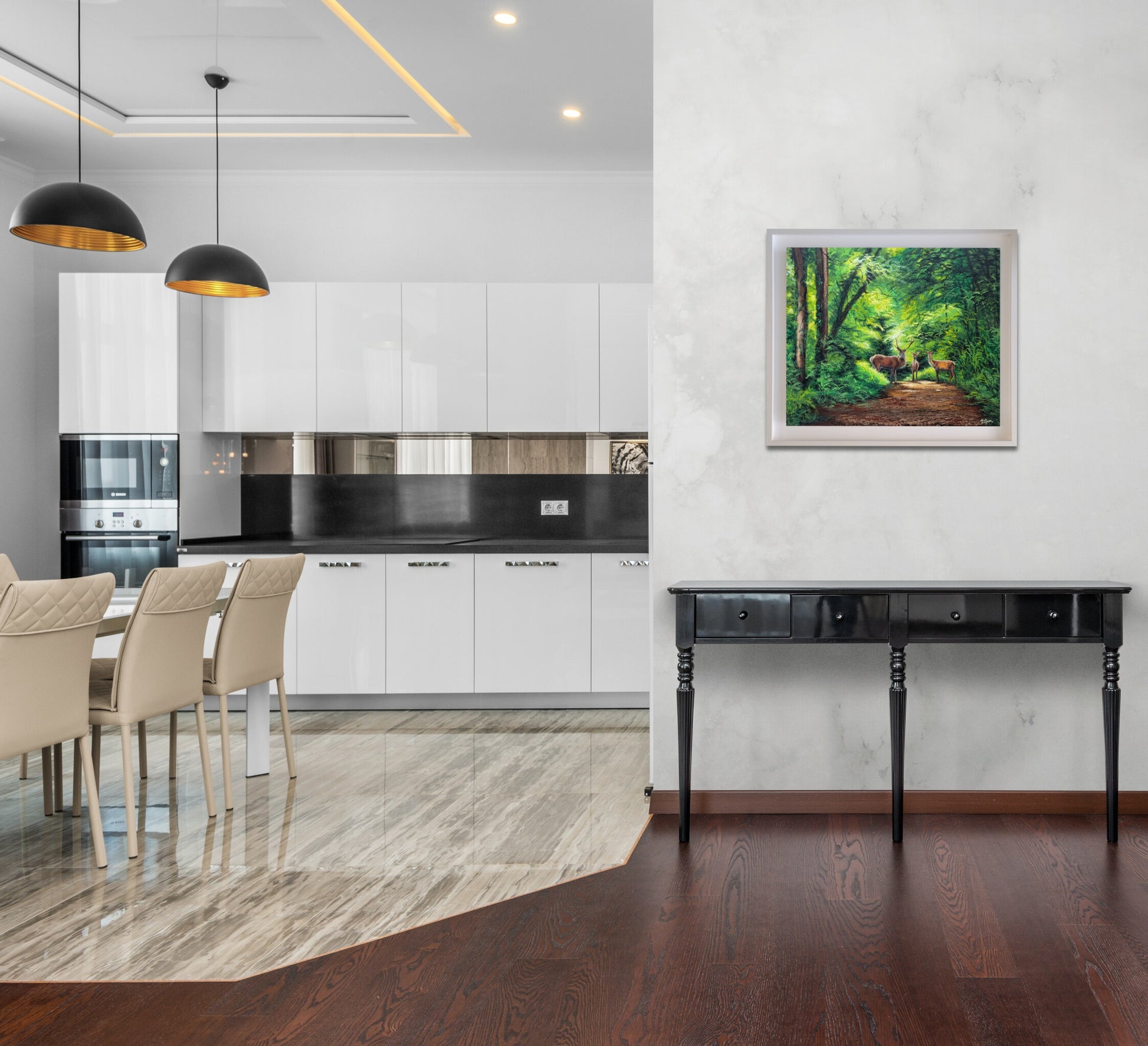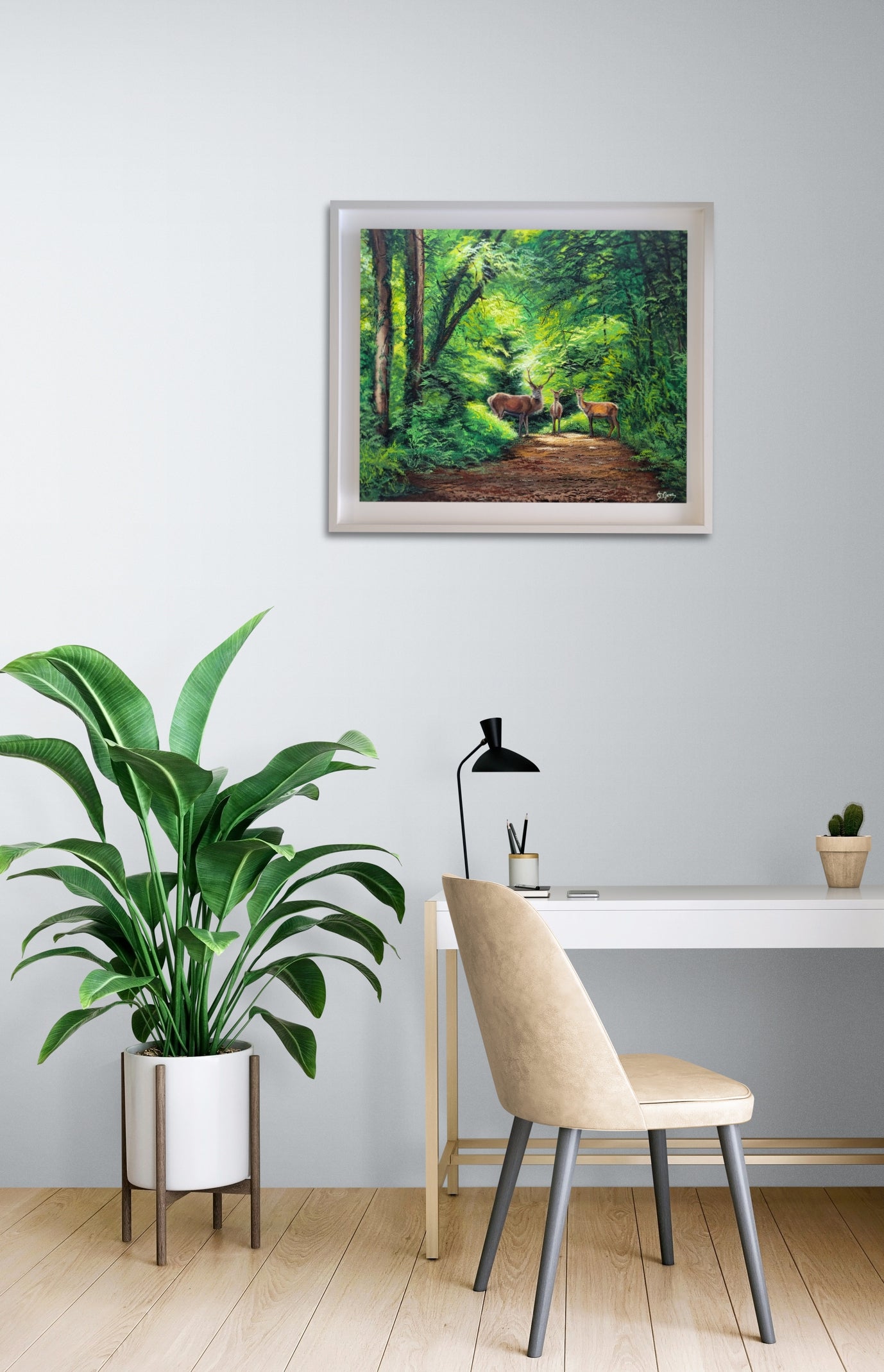The lush greens of the trees and foliage create a calming backdrop, while subtle light filters through the forest, enhancing the sense of peace and balance. The deer meet the viewer’s gaze with gentle curiosity, unafraid and composed, establishing an intimate connection between the artwork and its observer.