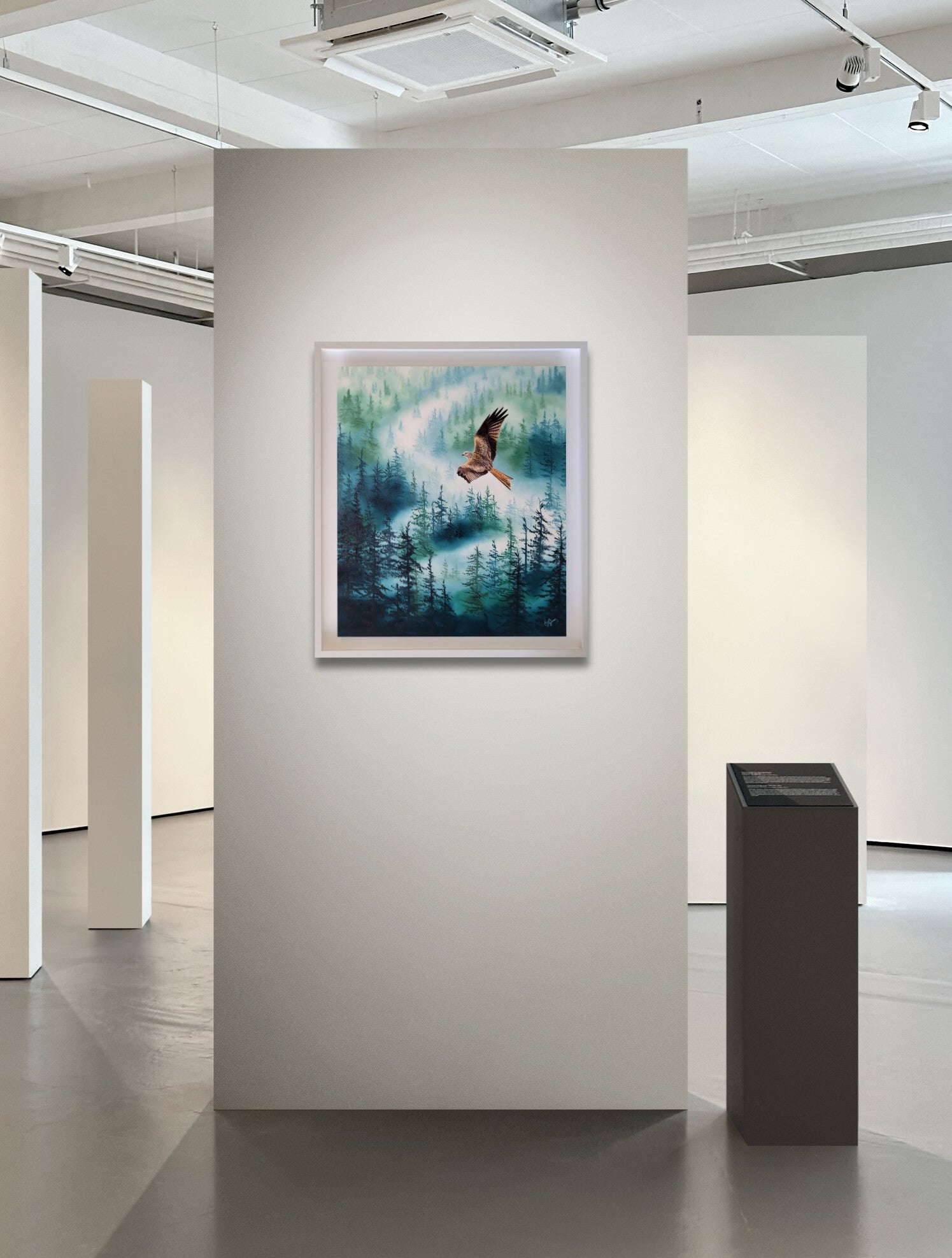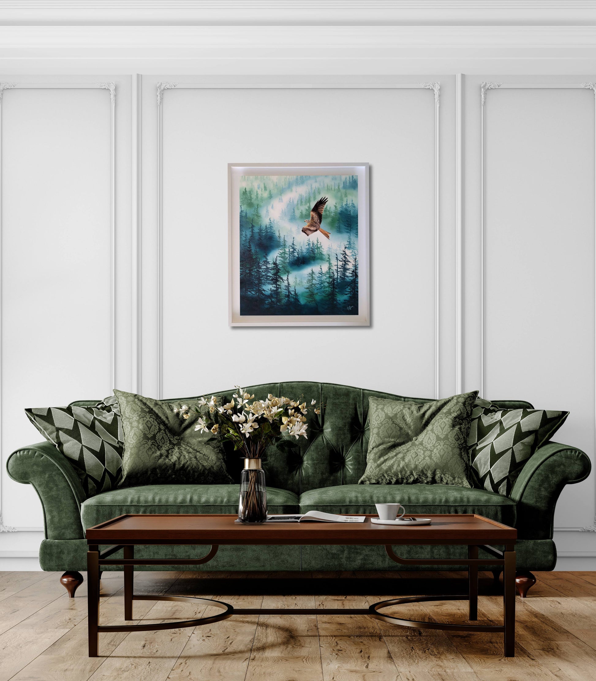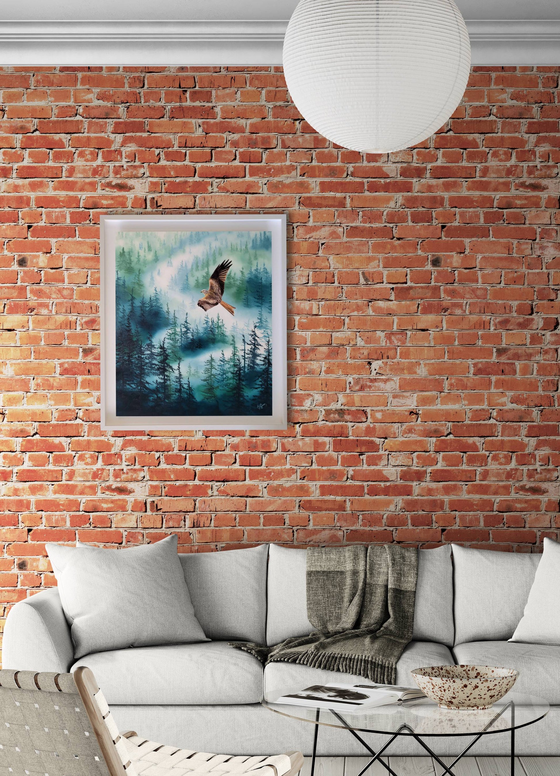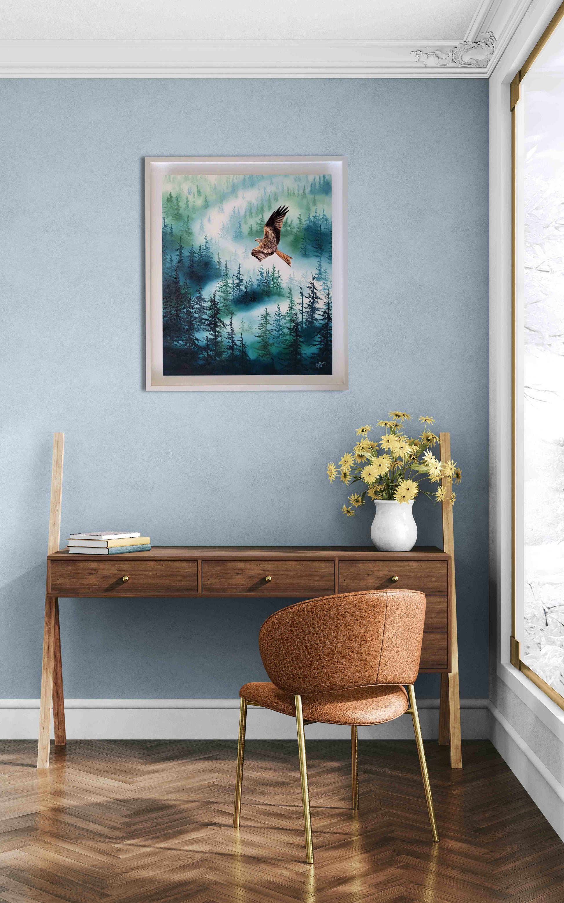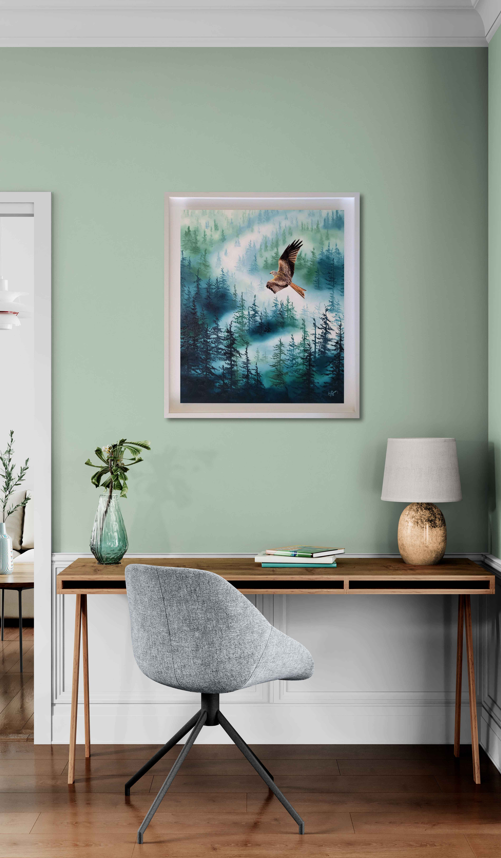 Painted with meticulous attention to realism, the red kite contrasts beautifully against the misty woodland behind it, giving the work a compelling presence and sense of movement.