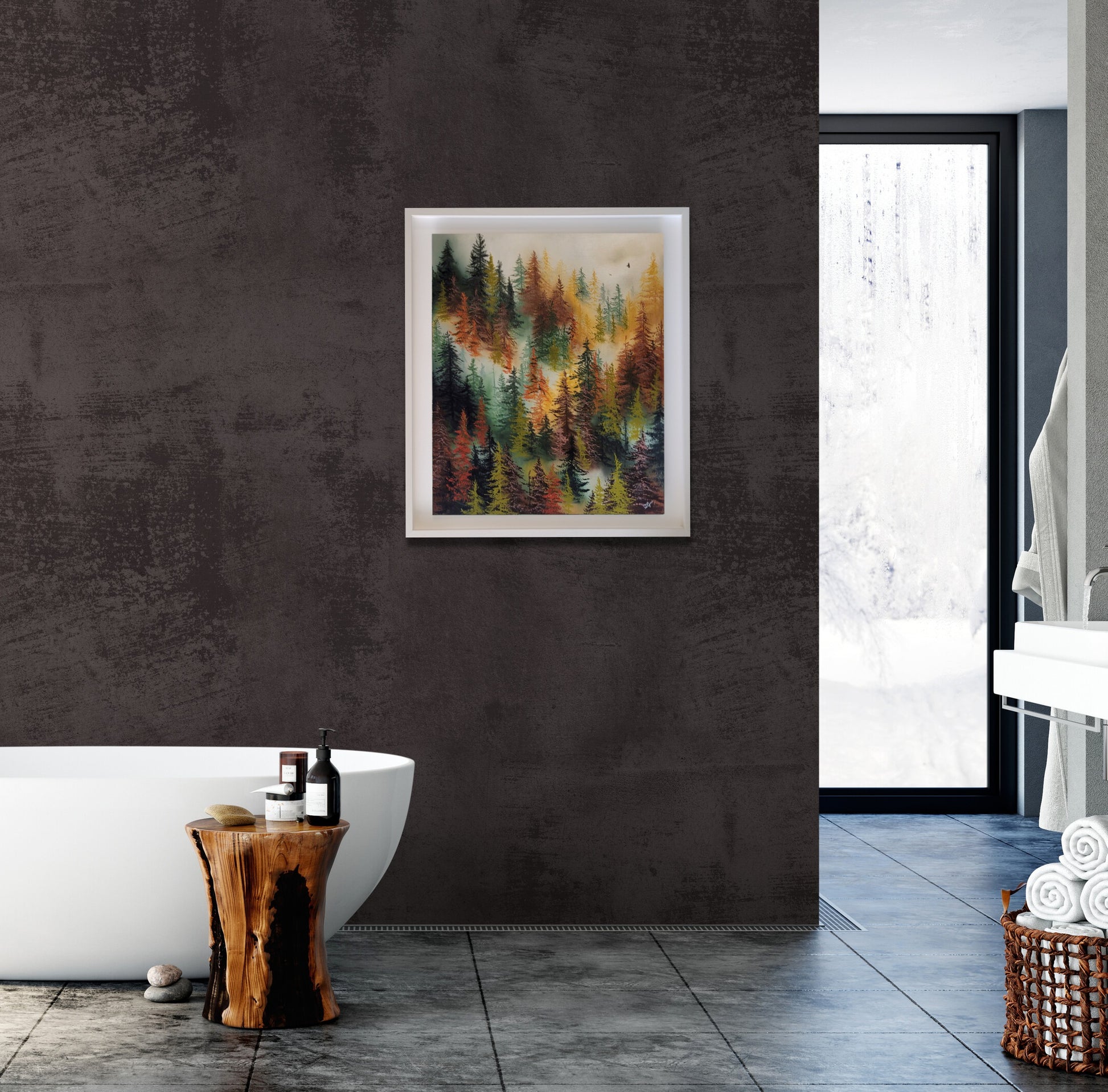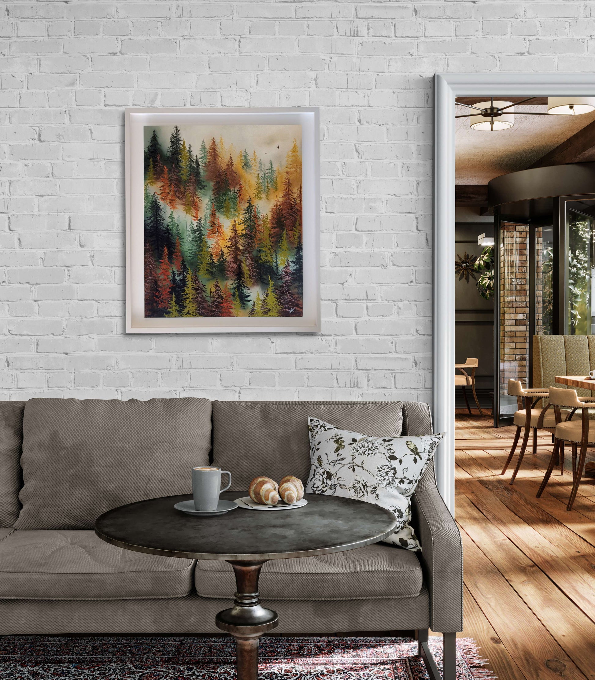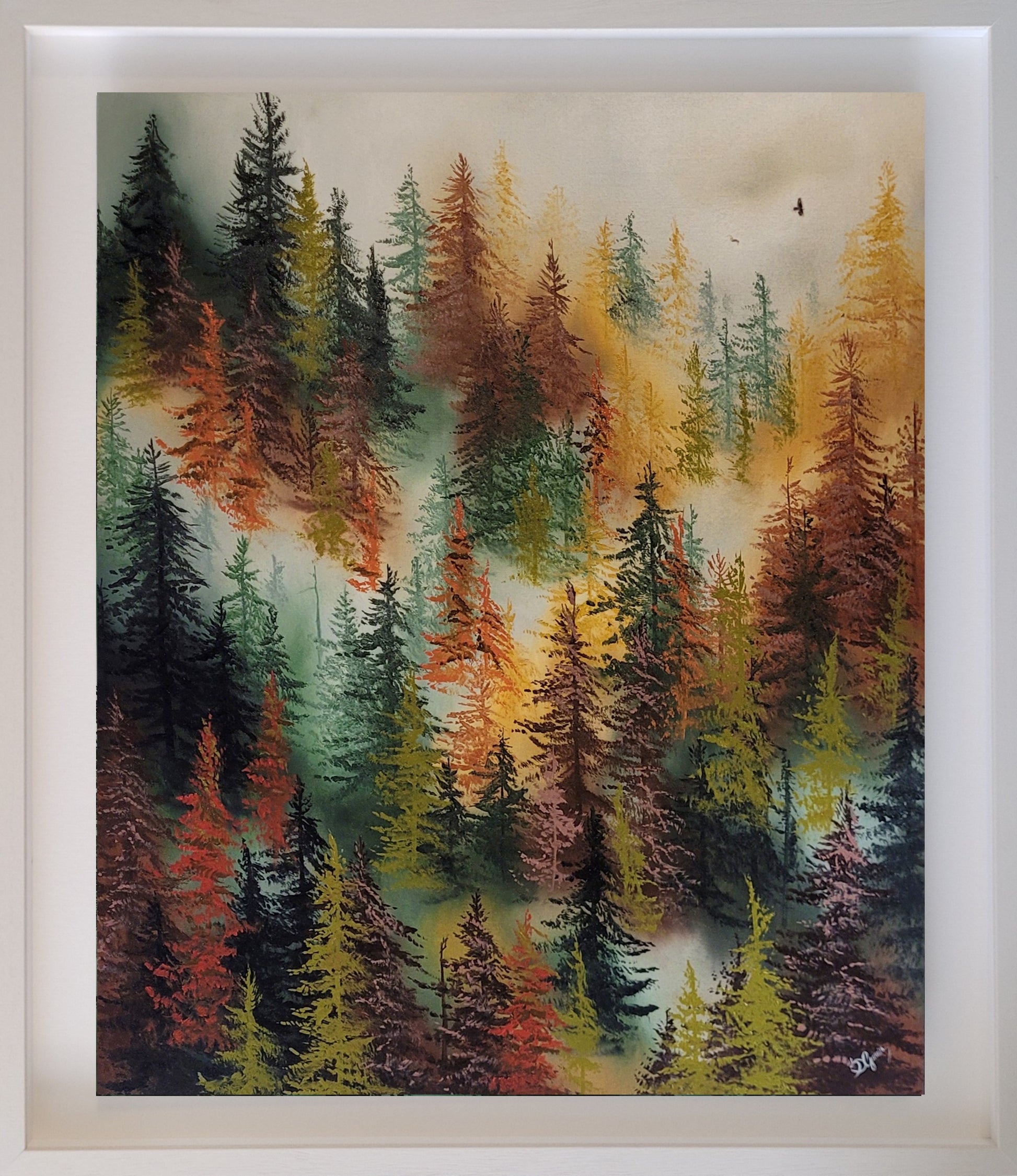 This calming autumn landscape invites the viewer into a quiet, meditative forest wrapped in soft morning mist. Warm seasonal tones gently emerge through layers of fog, creating a serene atmosphere that evokes stillness and reflection. Toward the top of the painting, wild birds glide through the haze, with two subtle birds of prey appearing almost ghostlike as they fade into the mist.